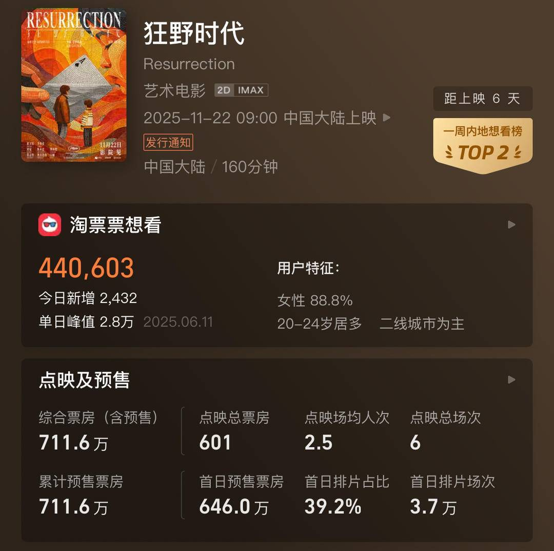据预售页面显示玖富配资,影片片长为160分钟,截至11:30,影片预售票房已破714万,观众特征中,女性占比88.8%,以20-24岁居多。